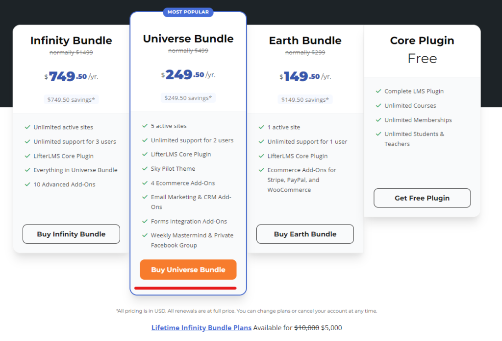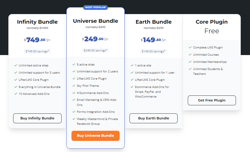 - Infinity Bundle ($1499/year) - Unlimited number of sites. Supports up to 3 users. Includes all the features of the Universe Bundle and all of LifterLMS's expansion add-ons. If you want to use the quiz expansion, course group features, or create a community on your site, this plan is definitely the best value.