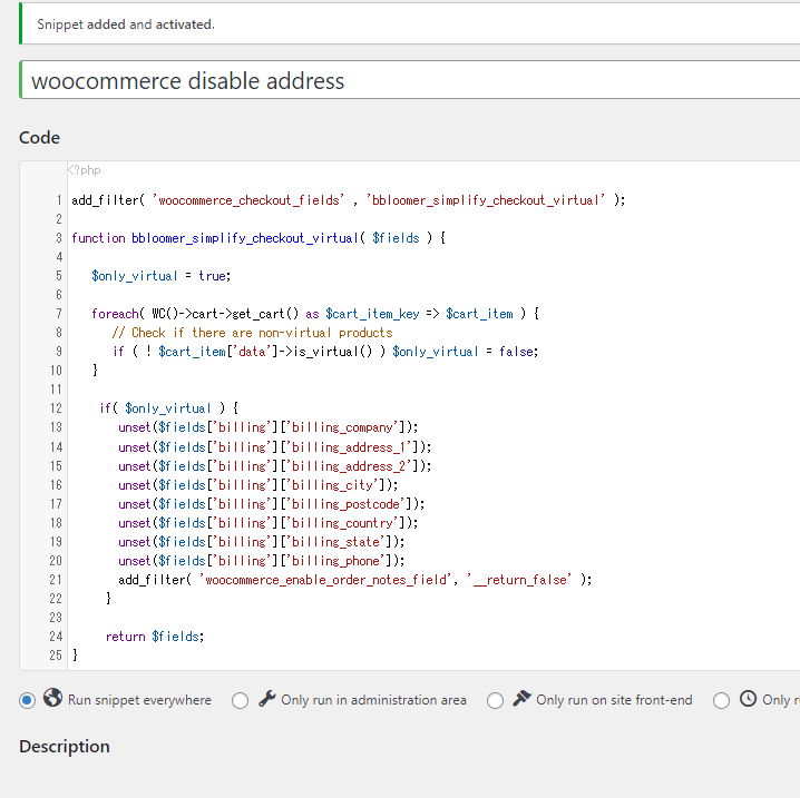 add_filter( 'woocommerce_checkout_fields' , 'bbloomer_simplify_checkout_virtual' ); function bbloomer_simplify_checkout_virtual( $fields ) { $only_virtual = true; foreach( WC()->cart->get_cart() as $cart_item_key => $cart_item ) { // Check if there are non-virtual products if ( ! $cart_item['data']->is_virtual() ) $only_virtual = false; } if( $only_virtual ) { unset($fields['billing']['billing_company']); unset($fields['billing']['billing_address_1']); unset($fields['billing']['billing_address_2']); unset($fields['billing']['billing_city']); unset($fields['billing']['billing_postcode']); unset($fields['billing']['billing_country']); unset($fields['billing']['billing_state']); unset($fields['billing']['billing_phone']); add_filter( 'woocommerce_enable_order_notes_field', '__return_false' ); } return $fields; }