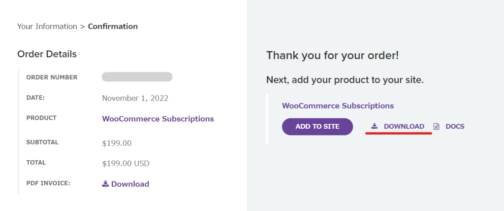 Click [DOWNLOAD]. The file will be downloaded with the file name "woocommerce-subscriptions.zip".