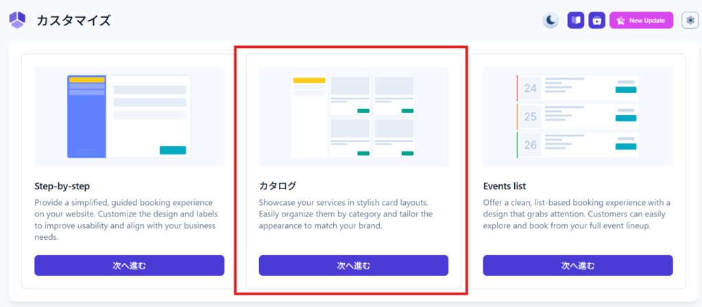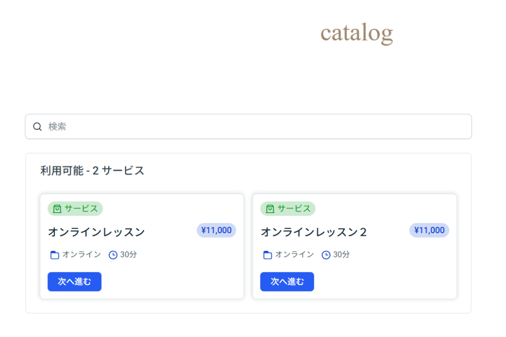 今回は、カタログを使っているので、こちらを選択して【次へ進む】をクリックします。