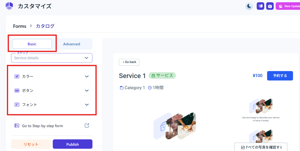 Basic設定では、カラー、ボタンデザイン、フォントの設定を変更できます。