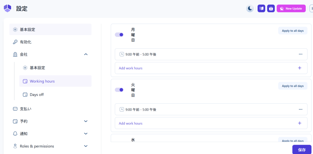 Amelia 会社情報 Working hours設定