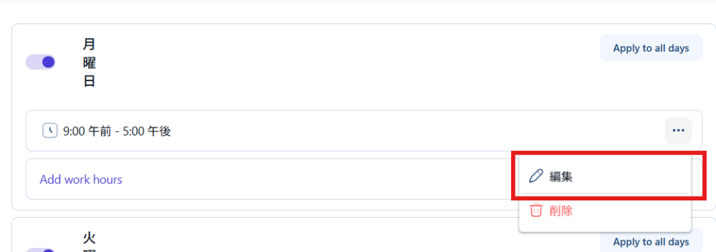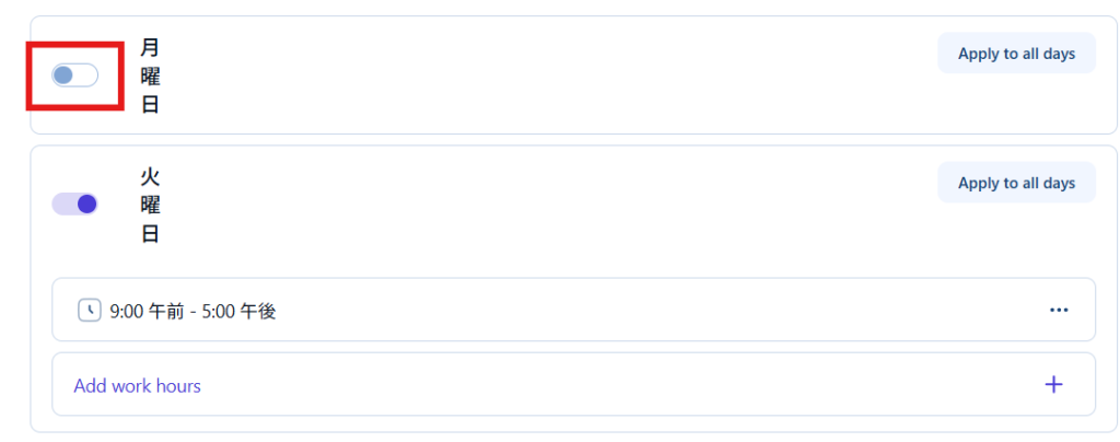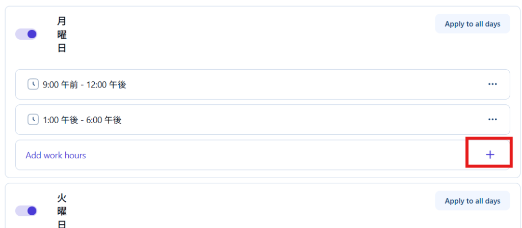 休憩をはさむ場合は、Add work hoursより複数の時間を追加できるため、休憩時間を除いた時間を設定します。