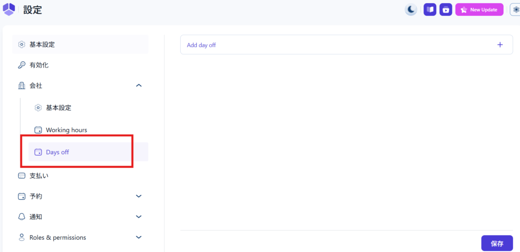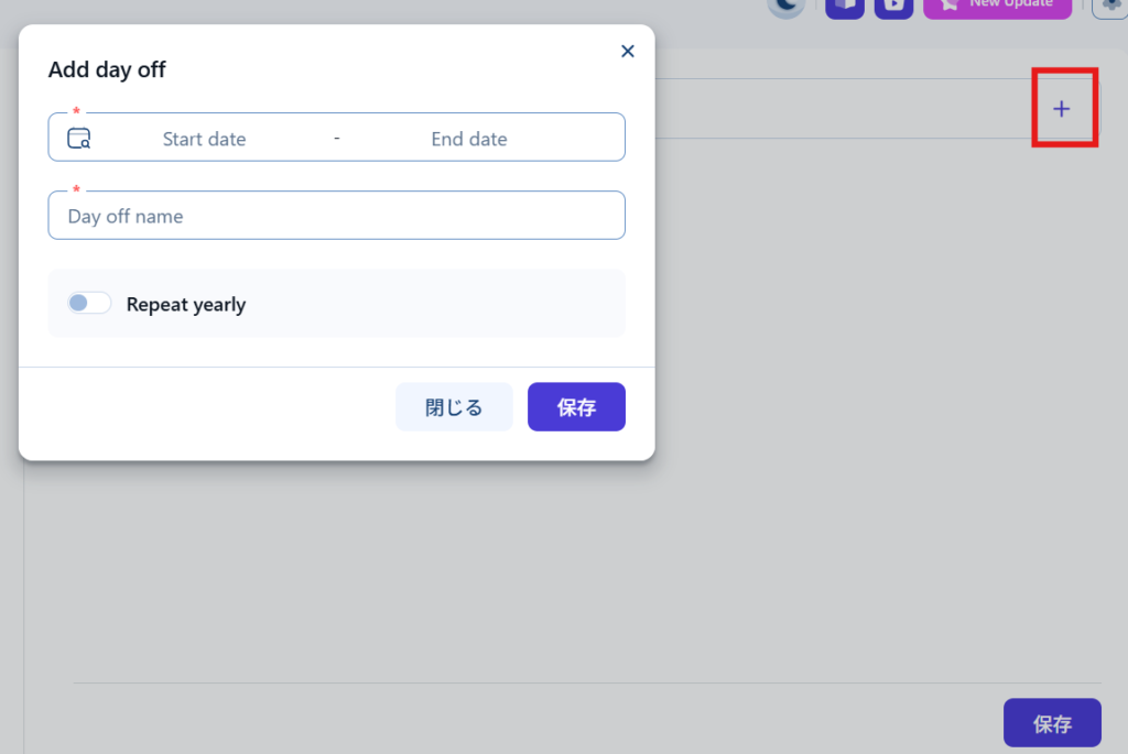 右側の【+】アイコンより、休業日を設定します。