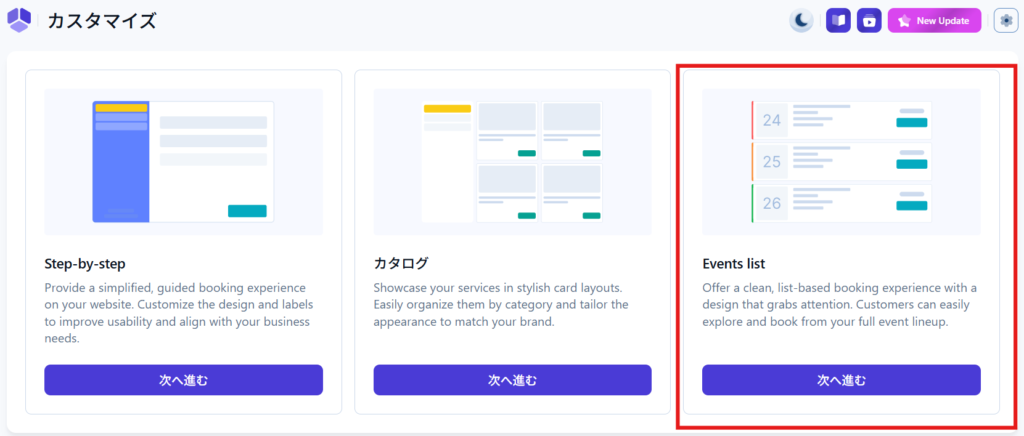 今回は、イベントを使っているので、Event listを選択して【次へ進む】をクリックします。