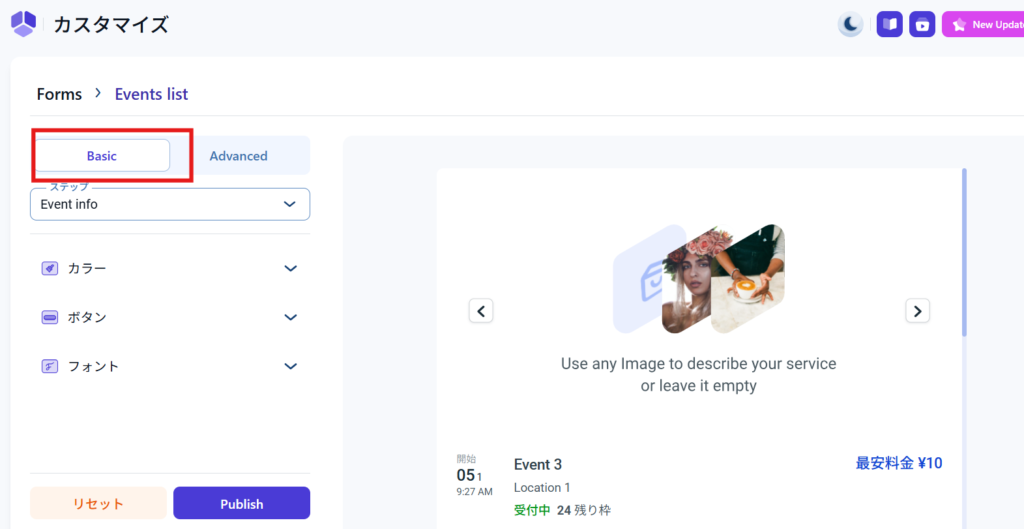 Basic設定では、カラー、ボタンデザイン、フォントの設定を変更できます。