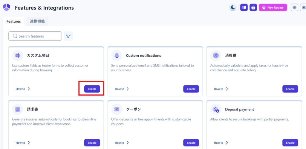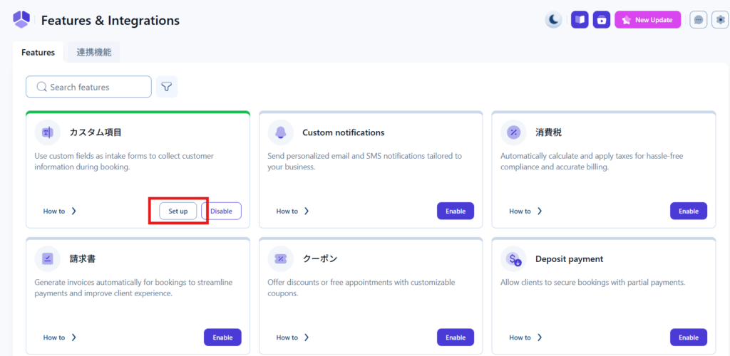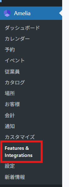 WordPress管理画面Amelia > Feature & Inteagrationをクリックします。