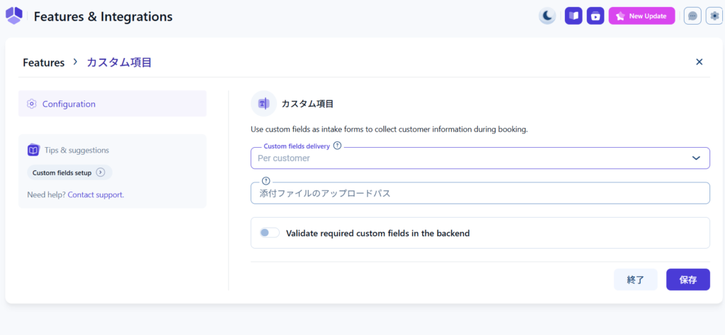 - Validate required custom fields in the backend ー 管理画面からの予約に必須項目を適応するかの設定。無効の場合、必須項目を入力しなくても予約を手動で追加できるようになります。