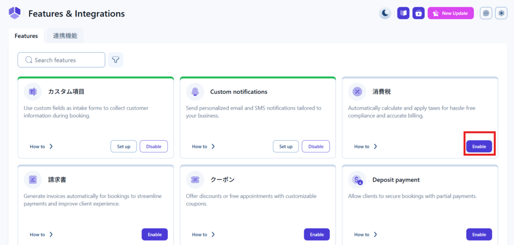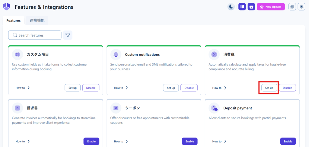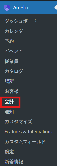WordPress管理画面Amelia > Feature & Inteagrationをクリックします。