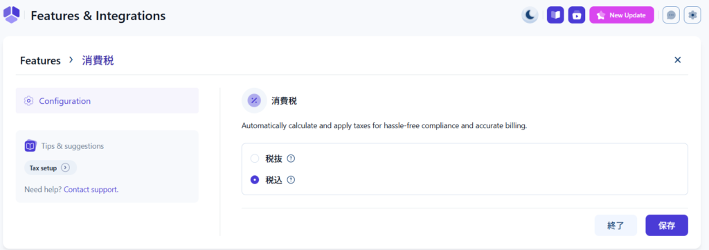 【Set up】をクリックすると、税金を外税、内税で表示させるか設定する画面に移行されます。
