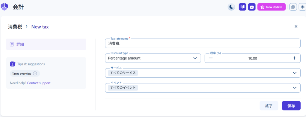 - サービス / イベント ー 税金を設定するサービスとイベントを選択