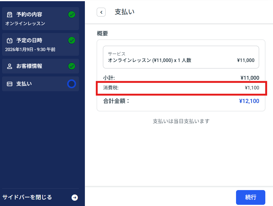 このように、予約フォームの金額確認画面で設定をした消費税が反映されます。