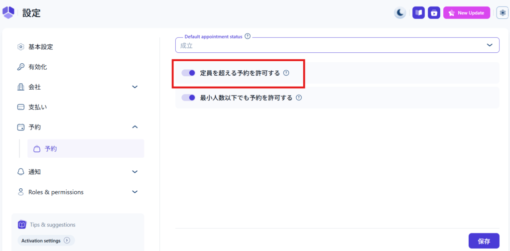 ONにした場合、定員を超えて予約をする顧客がいた場合、保留中として予約が出来るようになります。