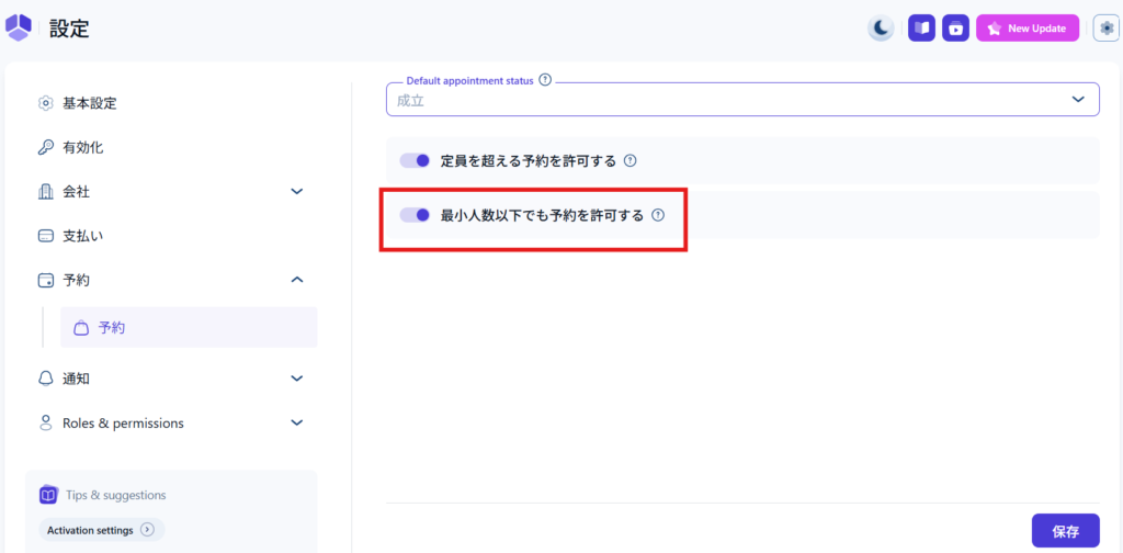 最少人数以下でも予約を許可する