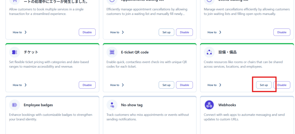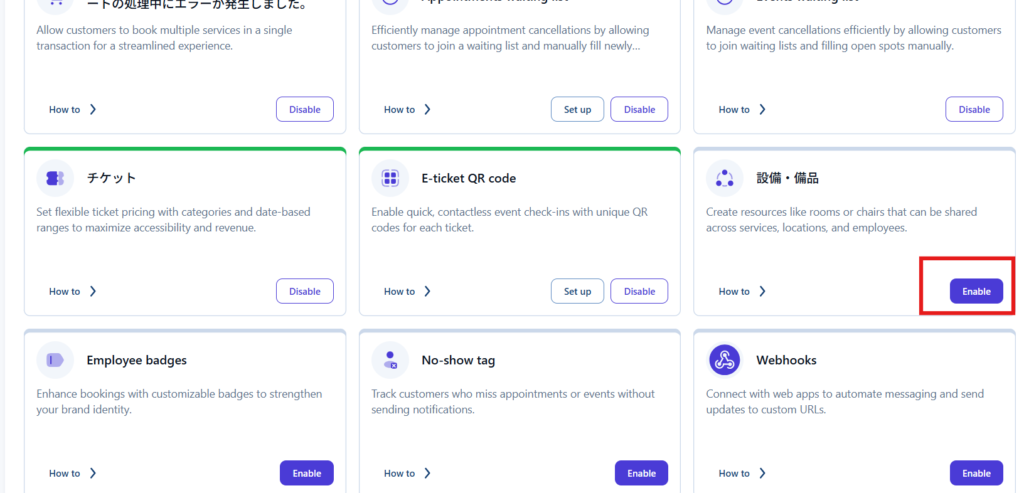 設備・備品を【Enable】にします。