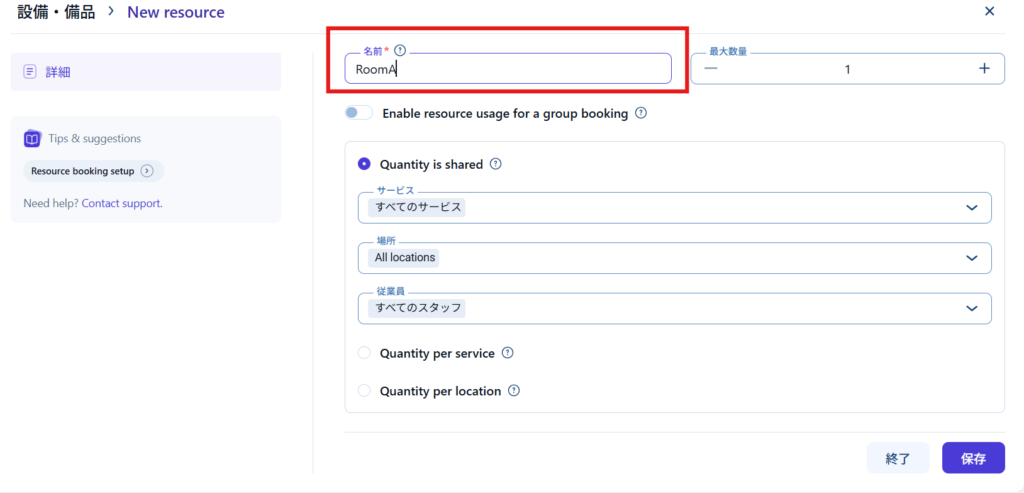 - Quantity per location ー 場所ごとにリソース数をカウント。場所ごとに部屋数は異なるため、チェックを入れるか、場所をAll locationではなく、指定をした方が良いです。