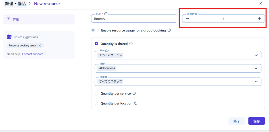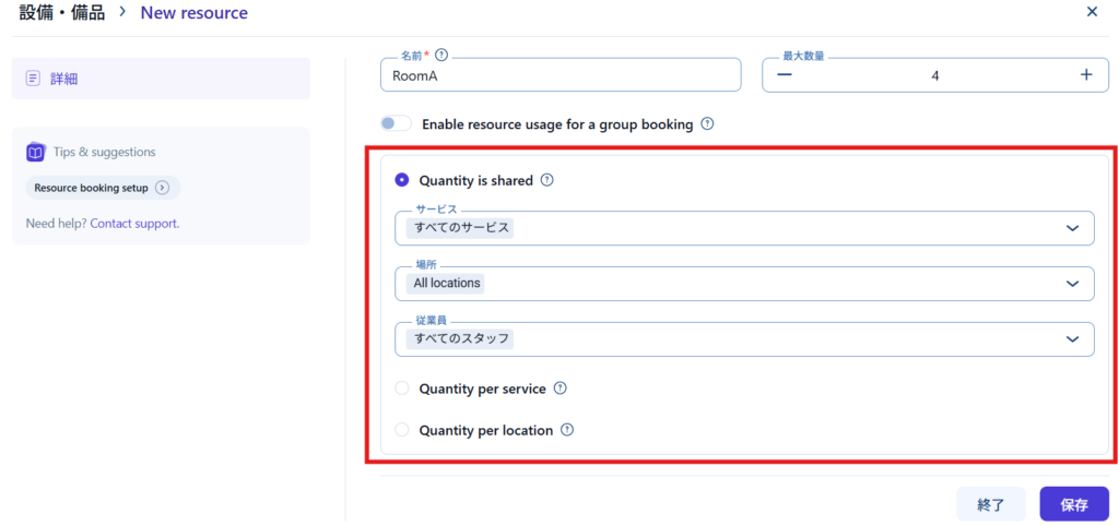 - Quantity per service ー サービスごとにリソース数をカウント。リソースが部屋の場合、サービスごとにリソースをカウントをしてしまうと、予約の数と使える部屋数が足りなくなってしまうため、チェックは入れないです。