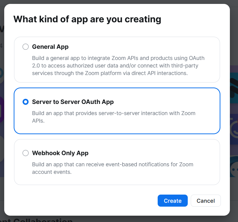 Server to Server OAuth Appを選択してCreateボタンをクリックします。