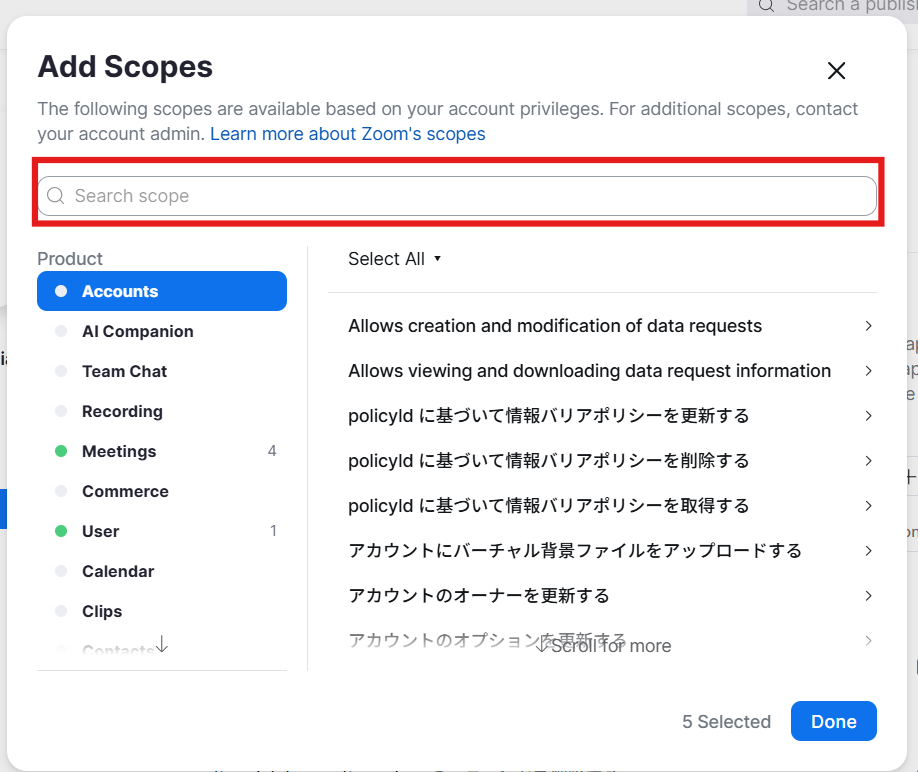 次に、Scopeタブに切り替えて、Add Scopesボタンをクリックして、5種類のScopeを追加します。
