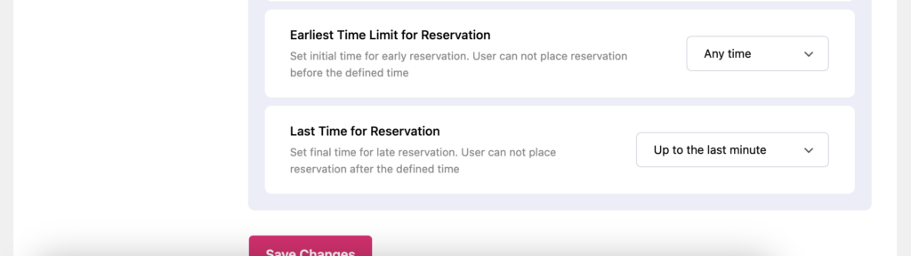 - Earliest Time Limit for Reservation - You can set how many days or weeks in advance you want to accept reservations. The default is any time, meaning there is no limit.