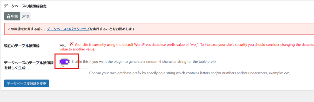 Once you have the backup, switch to the Database Prefix Settings tab, turn on "Generate new database table prefix", and click the "Change database prefix" button.