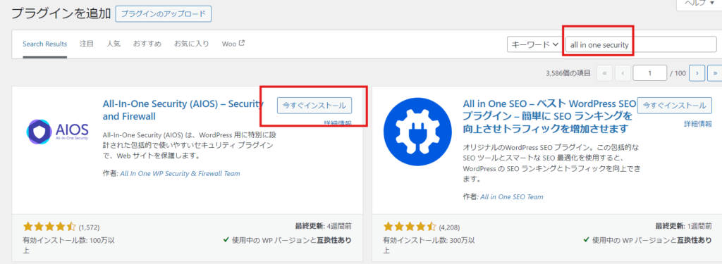 - The All in one Security plugin is on the left side of the image below, so click "Install now".