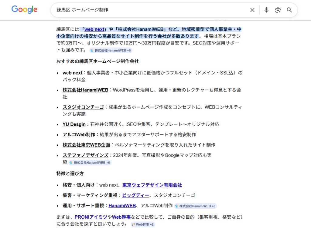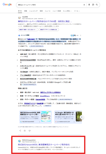 「練馬区 ホームページ制作」で検索したところ、弊社のサイト(株式会社HanamiWEB)が検索結果2位に表示されました。