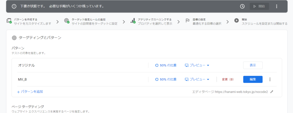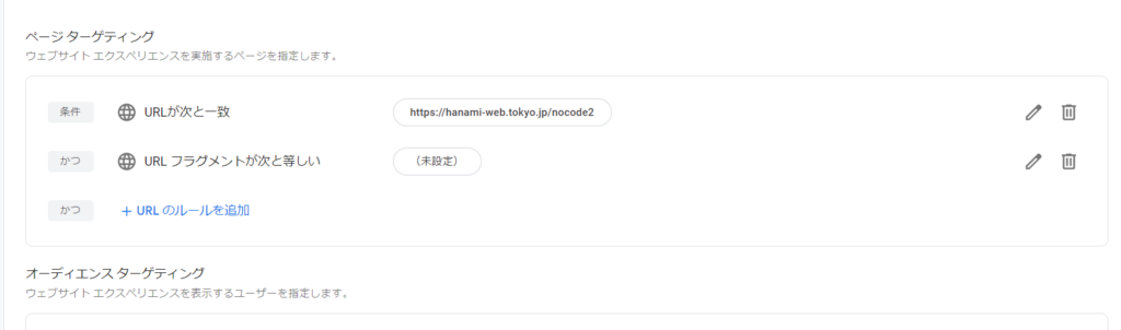 Set which page you want to target. The value you entered when you created the new experience should be set, so you can continue with the same setting.