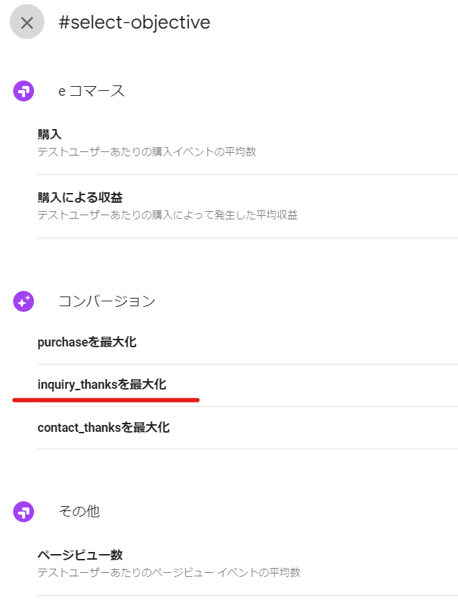 Since I had set up the conversion using Google Tag Manager, GA4, I was able to select it! The conversion on the training course page is an application for a one-on-one interview (request for information), so the goal is the application completion page called inquery_thanks. This is what I will set.