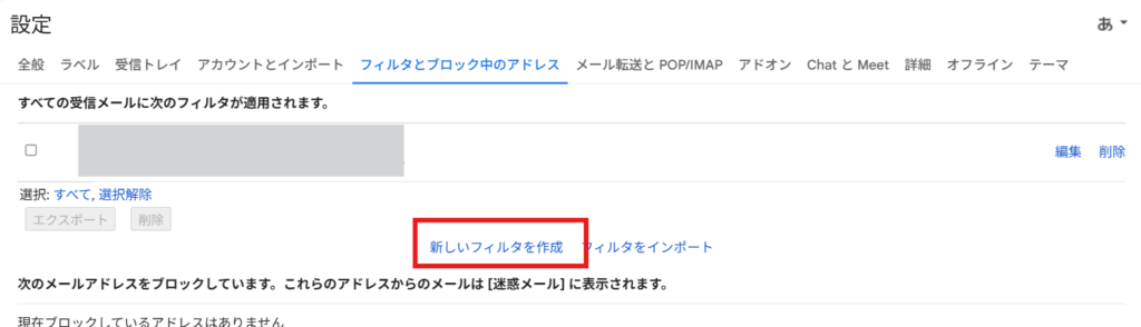 Create a new filter in Filters and Blocked Addresses, located to the right of Accounts and Imports.