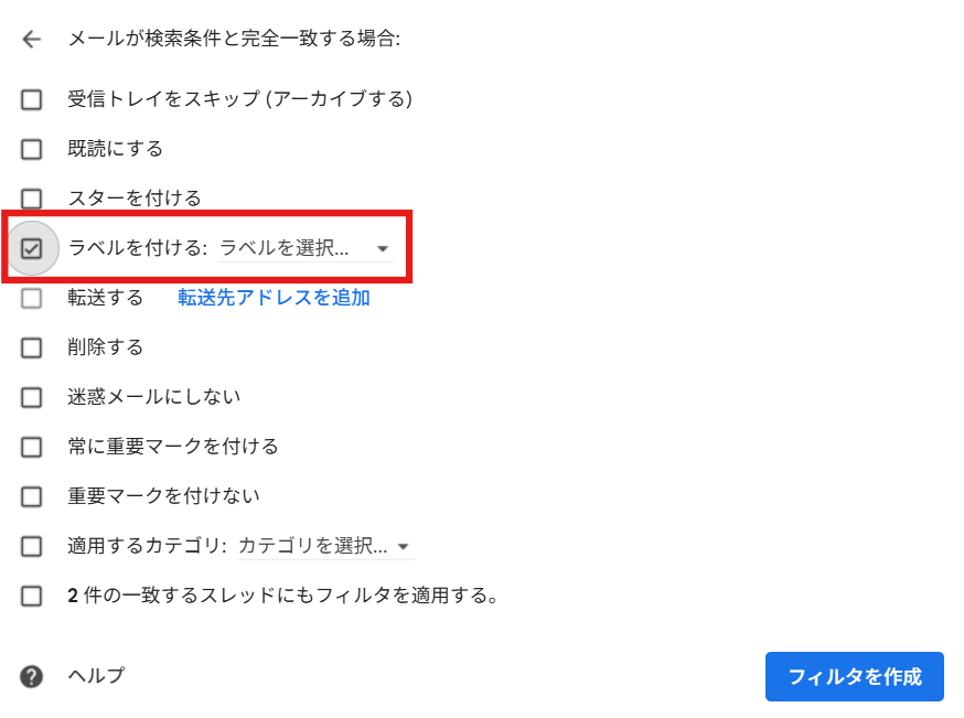 Check the box for Add label, select the label you want to add, and click the [Create filter] button.