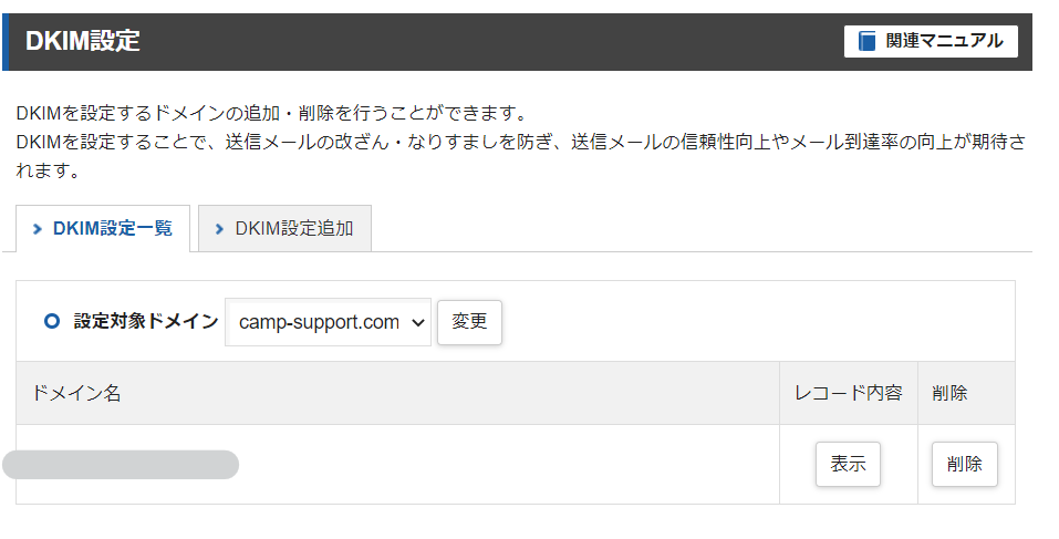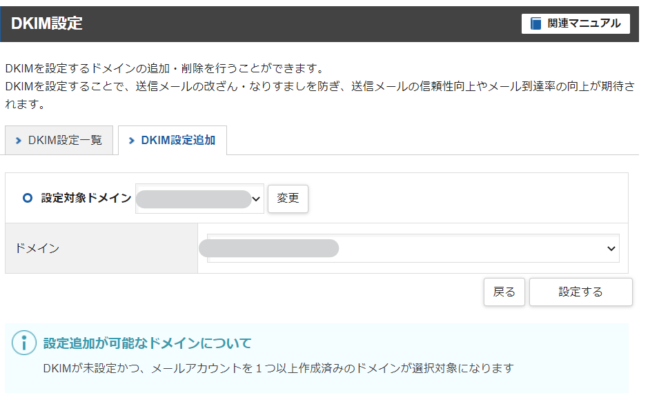 Select the domain managed by xserver from Add DKIM Settings, and finally click the Set button.