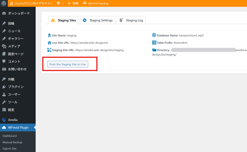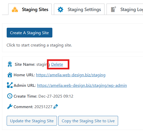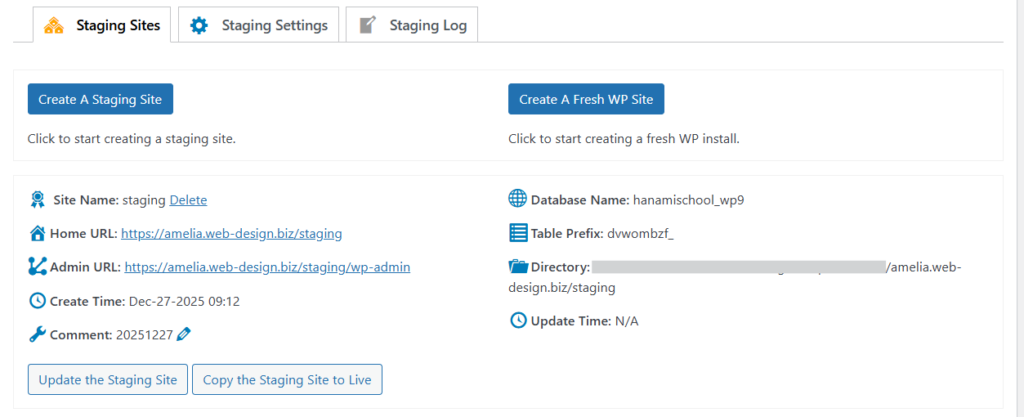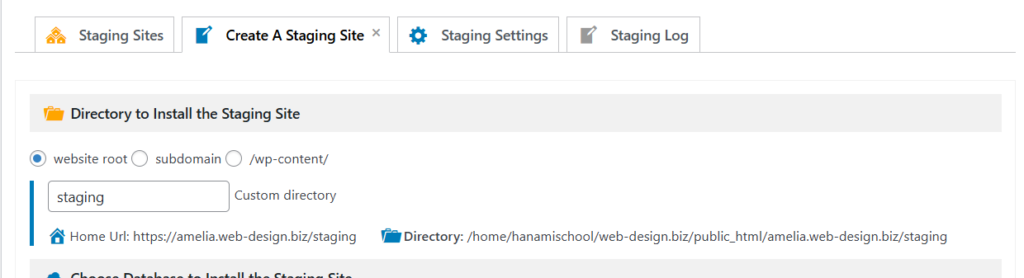 The staging site will be installed in the directory https://amelia.web-design.biz/staging.