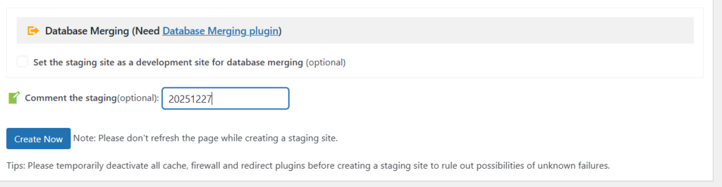 After checking the detailed settings of WPvivid Staging Pro, enter a clear comment in the comments and click Create Now.