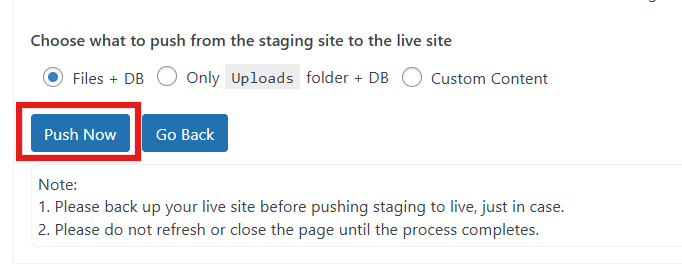 On the staging site, there is a button called “Push the Staging Site to Live,” so click on it.