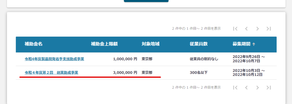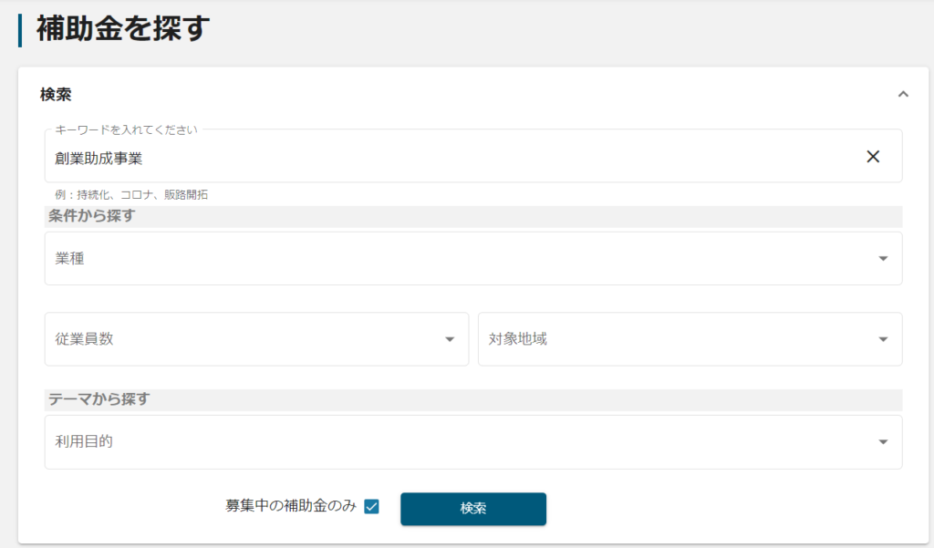 キーワードに「創業助成事業」と入力をして検索をしました。