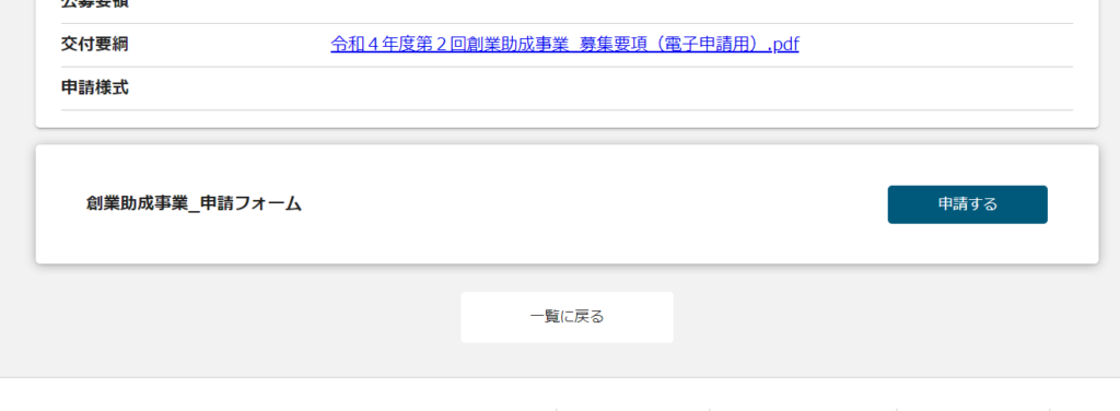 gBizIDでログインをすると、創業助成事業詳細の下部に【申請する】というボタンが出てきますので、こちらをクリックして進みます。