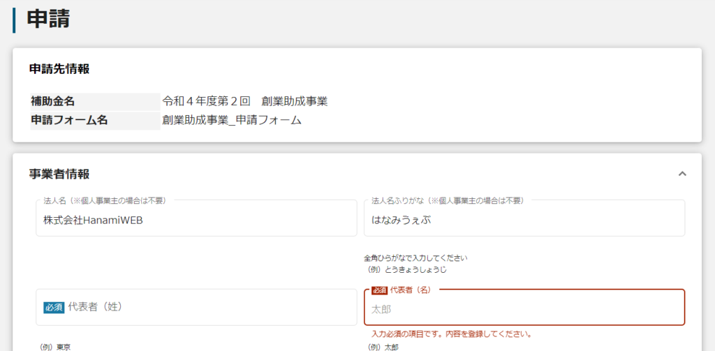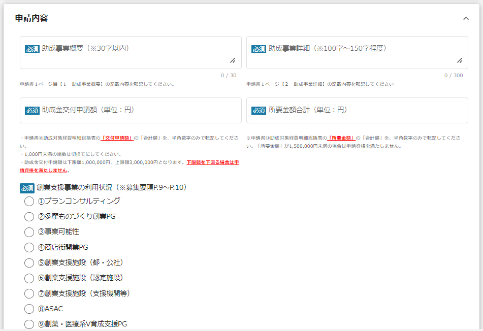 個人情報を入力した後は、創業助成金に関する申請内容を入力します。事業計画書に書いた内容と合わせます。