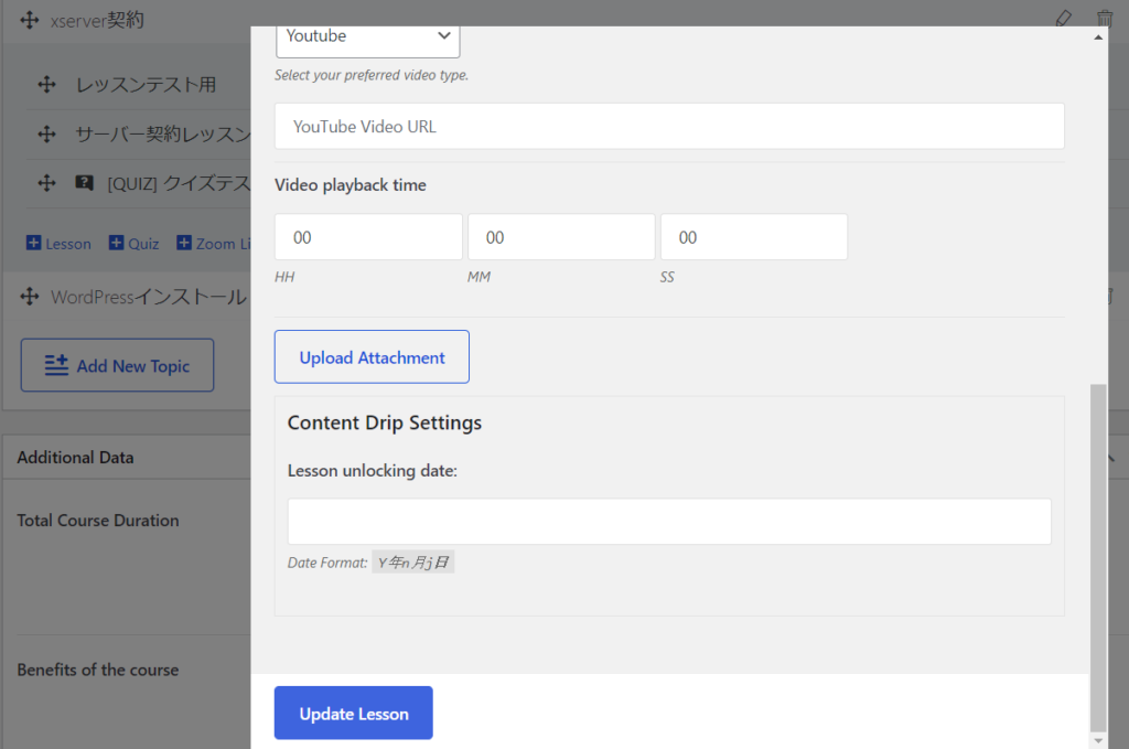以下はCourseビルダーのレッスン編集画面です。下部にCourse Drip設定項目が増え、公開日時を設定します。
