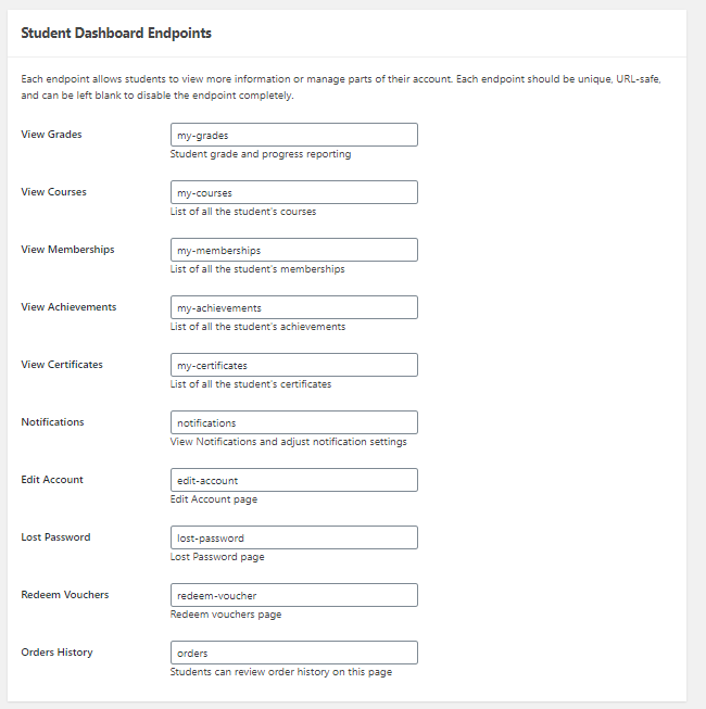受講生のダッシュボードの項目で表示されるページそれぞれのURLスラッグを設定します。
