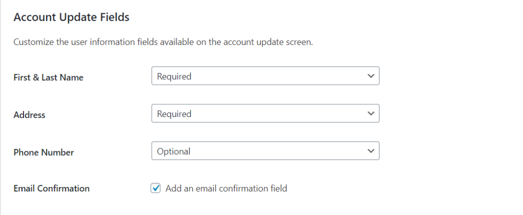 アカウントをアップデートする際の入力フィールドの設定をします。Checkout Fieldsの設定を同じになります。