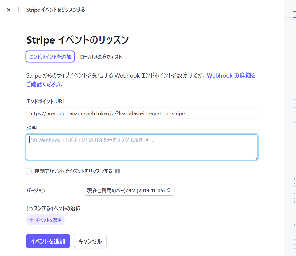 - Endpoint Secret ー Stripeで発行したエンドポンドシークレットキー入力