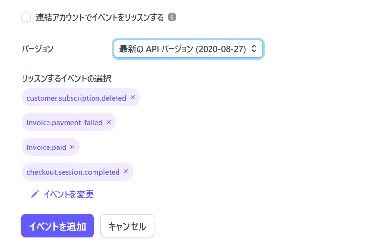 customer.subscription.deleted/invoice.payment_failed / invoice.paid / checkout.session.completed4つのイベントを追加します。