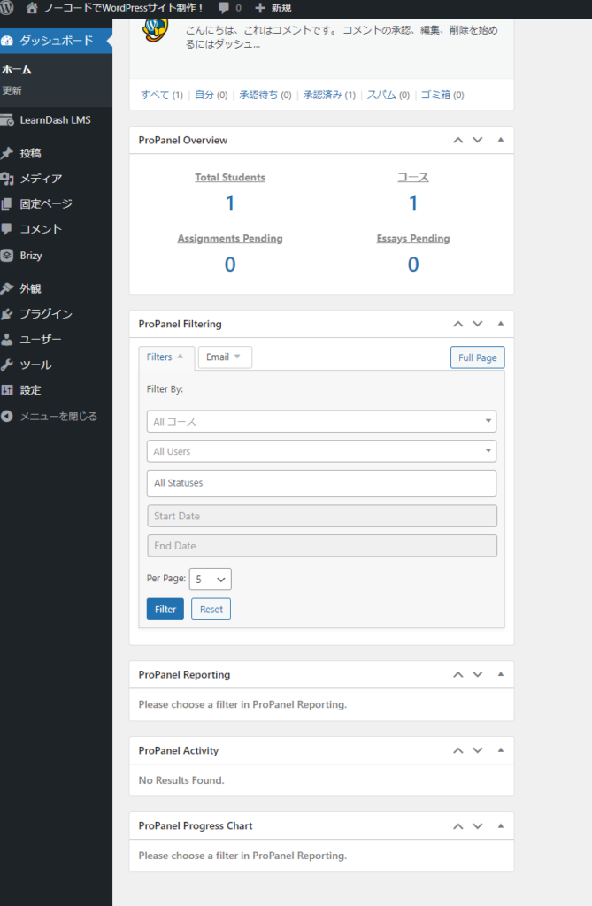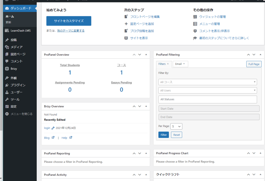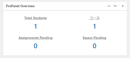 ProPanelのライセンスを入力すると、WrordPressのダッシュボード(一番TOPの階層)に4つのウィジェットが追加されています。