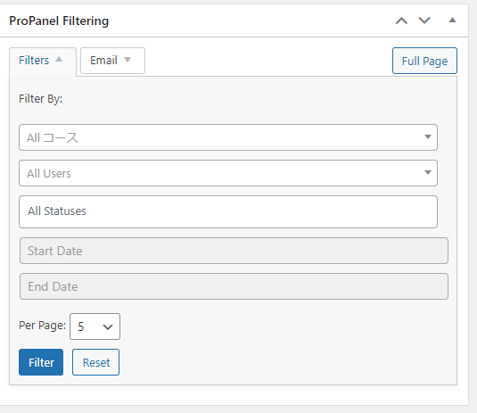 ユーザー、コース、グループでフィルターをかける事が出来ます。