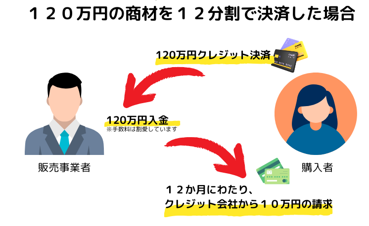通常の分割払いでは、サブスク決済同様に、12分割であれば、分割された金額が毎月事業者に入金されるのですが、今回紹介する仕組みは、事業者には通常のクレジット決済同様の一括入金で、顧客側は分割で支払うというフローになります。