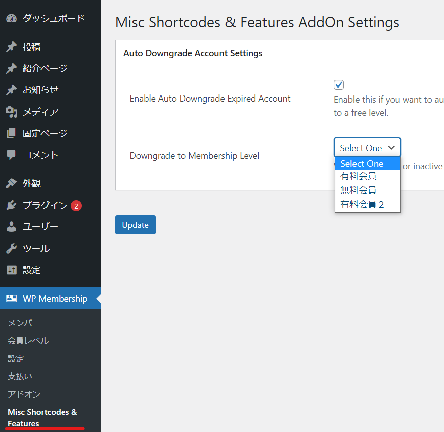 - Downgrade to Membership Level ー 期限切れのユーザーをどの会員にするか設定