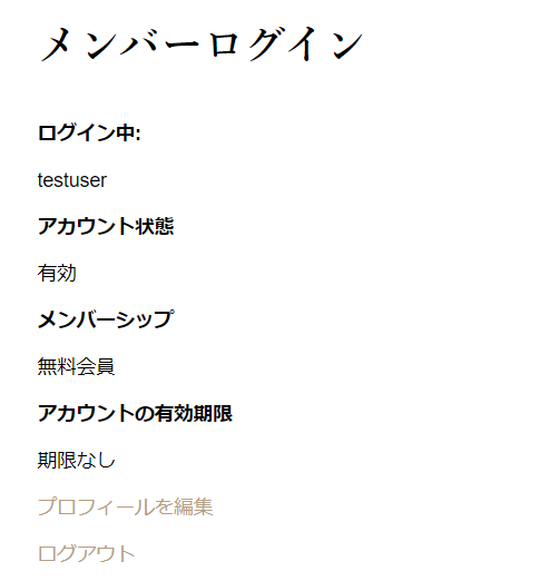テストをする時は、一度ログアウトして再ログインすると、このように無料会員に自動で切り替わっている事が確認できると思います。