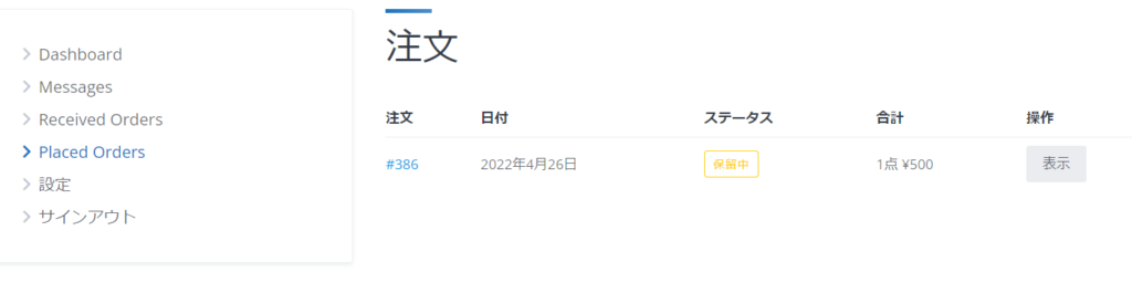 マイページのPlaced Ordersの箇所に注文が追加されます。