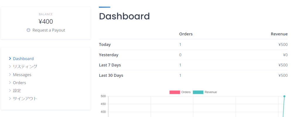 手数料20%設定なので、500円商品に20%の手数料を引かれて400円が売上金として計上されています。